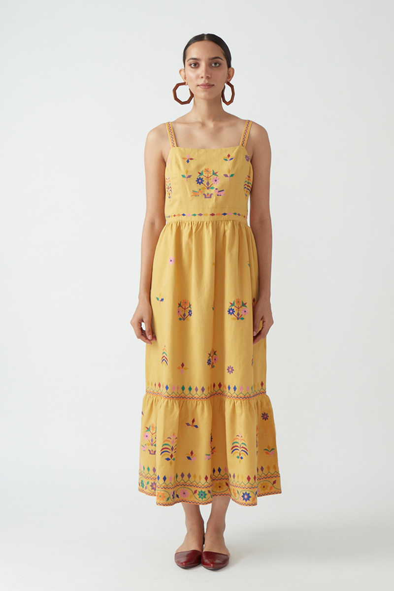 A head turning sleeveless embroidered dress with subtle and special multicolour threadwork. A tiered dress with a flattering silhouette which is a wardrobe essential for the summer. Keep handy for when the temperature starts to rise.