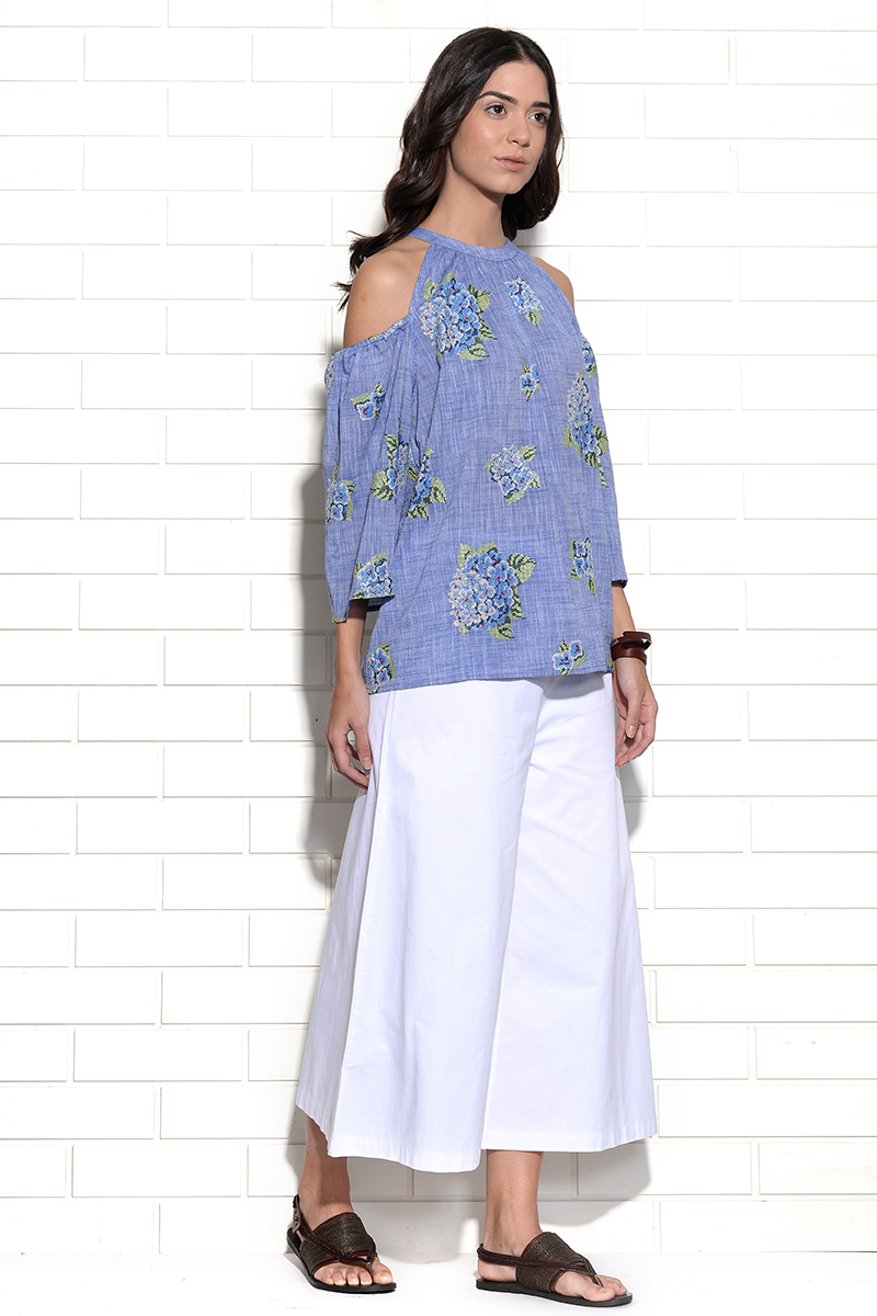 Cold shoulder top with hydrangea embroidery on chambray cotton and a loop button closure at back. A fun addition to your wardrobe.