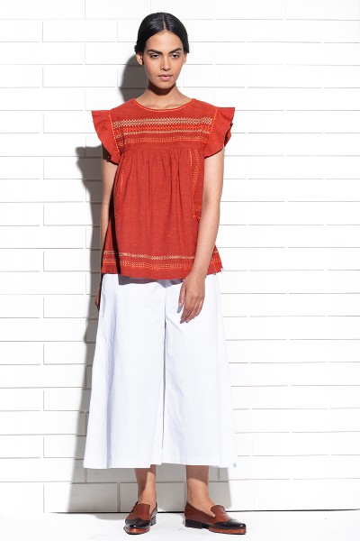 Cap sleeve rice stitch embroidered yoke gathered top. Get that vitamin boost with this youthful silhouette.