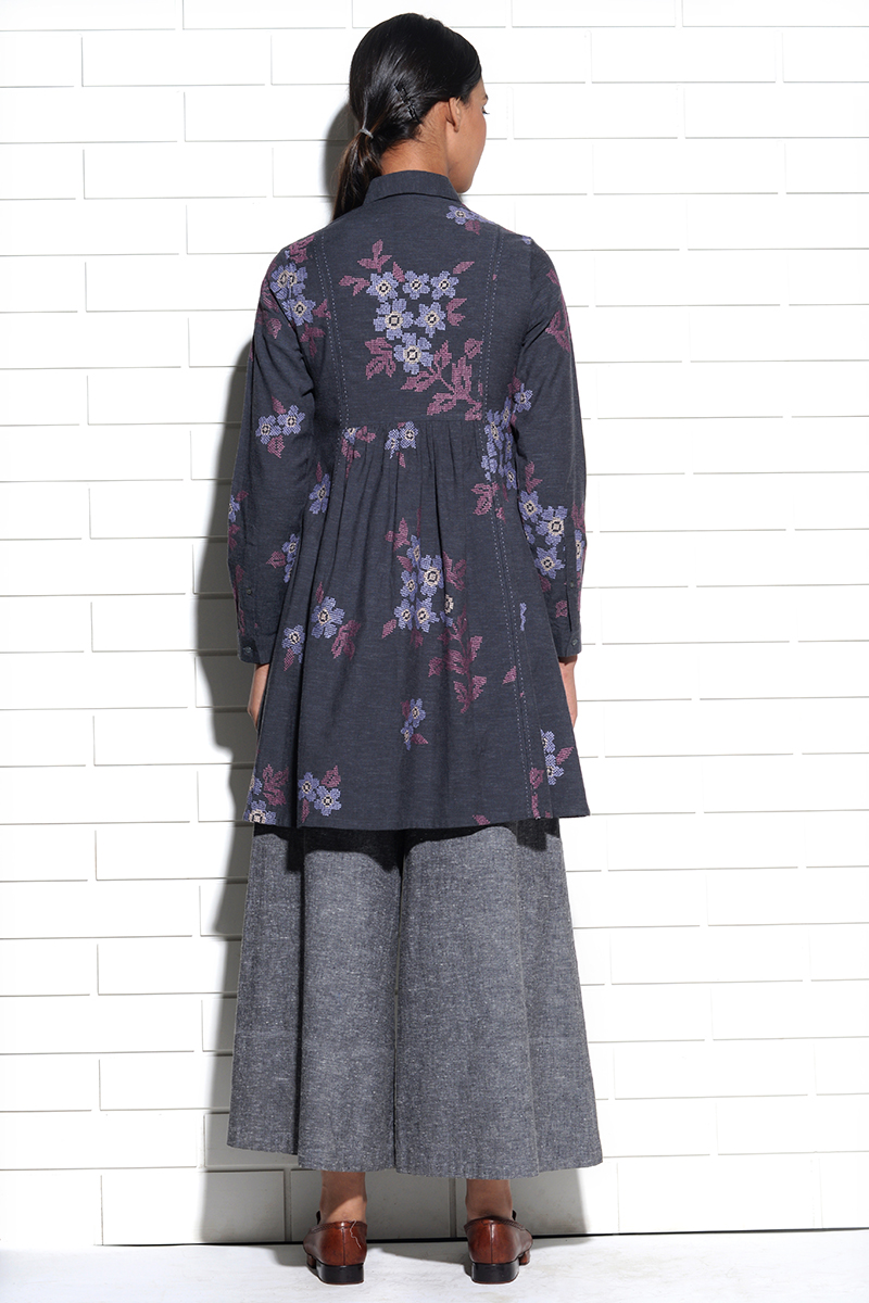 Collared shirt dress with front opening and all over floral cross stitch embroidery. A precious addition to your wardrobe. The handstitch detailing and embroidery lend a touch of that something special to this simple garment.